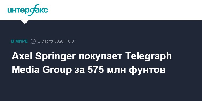 Москва. 6 марта. INTERFAX.RU - Германский медиаконцерн Axel Springer достиг соглашения о покупке британской медиагруппы Telegraph Media Group, говорится в совместном пресс-релизе.
