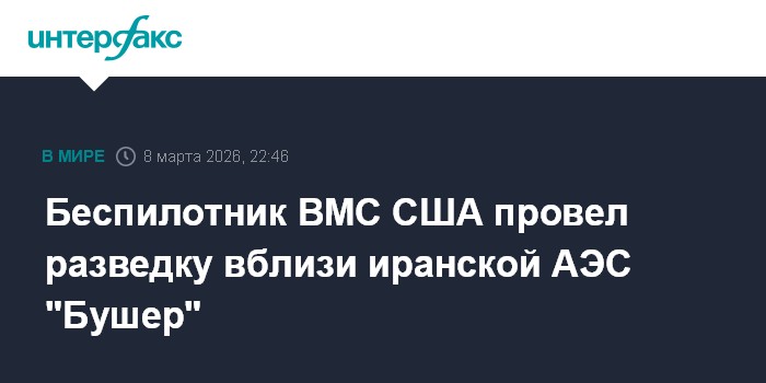 Москва. 8 марта. INTERFAX.RU - Дальний беспилотник радиоэлектронной разведки MQ-4C Triton ВМС США в воскресенье провел длительный полет над Персидским заливом вблизи иранской АЭС "Бушер" и нефтяного терминала на острове Харк, сообщает портал Itamilradar.