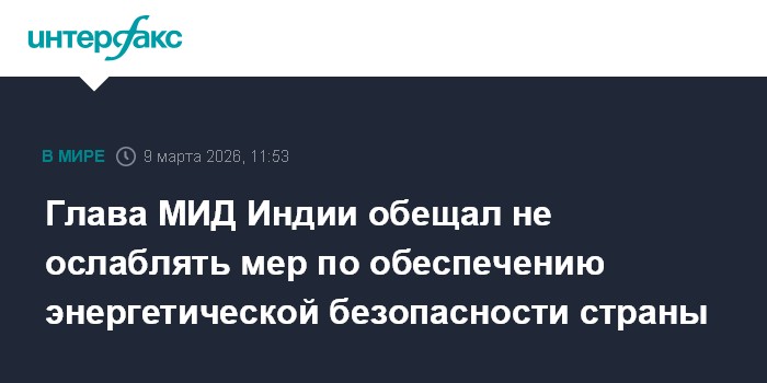 Москва. 9 марта. INTERFAX.RU - Глава МИД Индии Субраманьям Джайшанкар заявил, что в ситуации с конфликтом на Ближнем Востоке правительство продолжит реализацию мер по сохранению стабильных поставок энергоресурсов в страну.