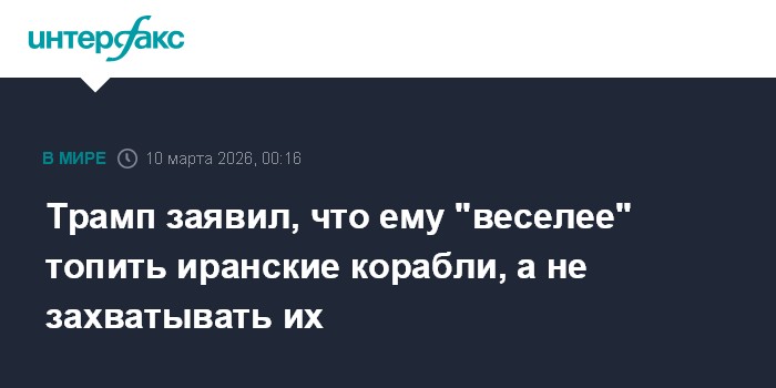 Москва. 10 марта. INTERFAX.RU - Президент США Дональд Трамп заявил, что предпочитает, чтобы армия США топила, а не захватывала, корабли ВМС Ирана, так как это кажется ему чем-то веселым.