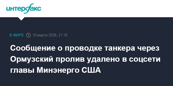 Москва. 10 марта. INTERFAX.RU - Недавнее сообщение о том, что ВМС США сопроводили танкер через Ормузский пролив, пропало со страницы в соцсети X главы американского Минэнерго Криса Райта, сообщает во вторник Bloomberg.