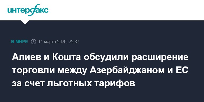 Москва. 11 марта. INTERFAX.RU - Президент Азербайджана Ильхам Алиев и президент Совета Евросоюза Антониу Кошта в ходе встречи в расширенном составе в Баку обсудили перспективы расширения торговых связей между Баку и Брюсселем на основе принципов льготных тарифов.