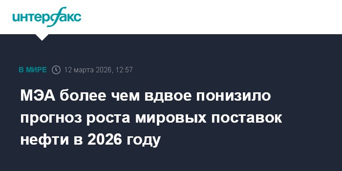 Москва. 12 марта. INTERFAX.RU - Международное энергетическое агентство (МЭА) на фоне конфликта на Ближнем Востоке вокруг Ирана резко понизило прогноз роста мировых поставок нефти на 2026 год – с 2,4 млн б/с до 1,1 млн б/с. Об этом говорится в ежемесячном отчете организации.