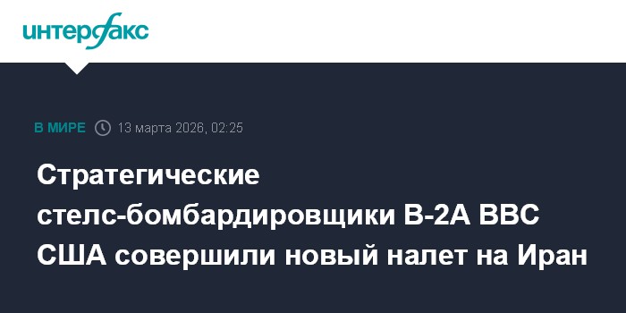 Москва. 13 марта. INTERFAX.RU - Два стратегических стелс-бомбардировщика B-2A Spirit ВВС США совершили очередной налет на Иран, следует из данных авиационного ресурса Military Air Tracking Alliance (MATA).