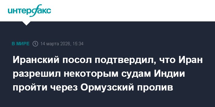 Москва. 14 марта. INTERFAX.RU - Посол Ирана в Индии Мохаммад Фатхали подтвердил в субботу, что Иран разрешил некоторым индийским судам пройти через Ормузский пролив.