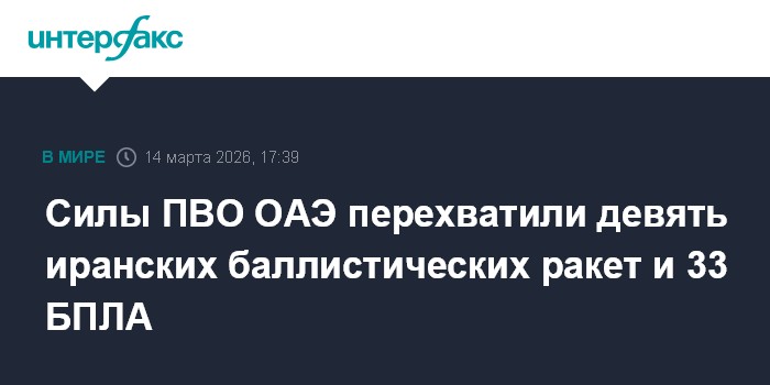 Москва. 14 марта. INTERFAX.RU - Средства противовоздушной обороны в субботу сбили девять баллистических ракет и 33 ударных беспилотника, запущенных Ираном, сообщило министерство обороны ОАЭ.
