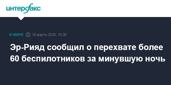 Москва. 16 марта. INTERFAX.RU - В Минобороны Саудовской Аравии заявили о перехвате более 60 беспилотников в ночь на понедельник, часть из них были нацелены на столицу королевства Эр-Рияд, сообщает "Аль-Арабийя".