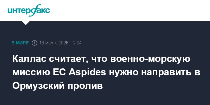 Москва. 16 марта. INTERFAX.RU - Глава дипломатии ЕС Кая Каллас заявила, что военно-морская миссия Евросоюза Aspides должна быть перенаправлена из Красного моря в Ормузский пролив для оказания помощи в возобновлении поставок нефти и газа по этому маршруту.