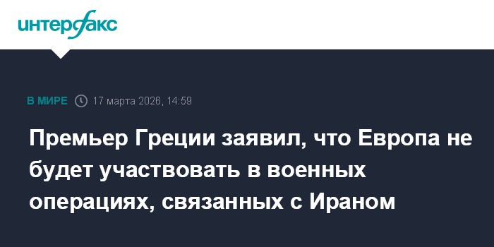 Москва. 17 марта. INTERFAX.RU - Европа, в том числе Греция, не будут принимать участие в каких-либо военных операциях, связанных с Ираном, заявил греческий премьер-министр Кириакос Мицотакис.