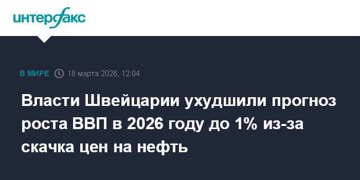 Москва. 18 марта. INTERFAX.RU - Правительство Швейцарии ухудшило прогноз роста ВВП страны в 2026 году до 1% с ожидавшихся ранее 1,1% из-за скачка цен на энергоносители на фоне войны на Ближнем Востоке.