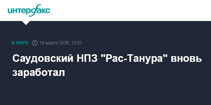 Москва. 18 марта. INTERFAX.RU - Нефтеперерабатывающий завод "Рас-Танура" в Саудовской Аравии возобновил работу после того, как ее пришлось прервать из-за атак беспилотников в начале марта, сообщает в среду Bloomberg.
