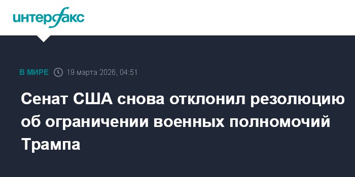 Москва. 19 марта. INTERFAX.RU - Сенат США вновь отклонил резолюцию, требующую от президента Дональда Трампа получить одобрение Конгресса на военные действия против Ирана.