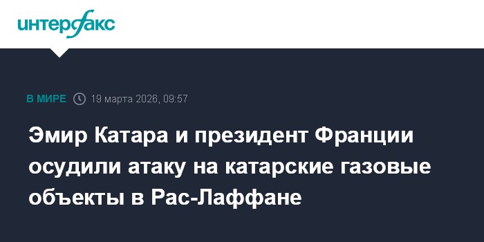 Москва. 19 марта. INTERFAX.RU - Катарский эмир Тамим ибн Хамад аль-Тани и президент Франции Эммануэль Макрон в телефонном разговоре заявили, что удар по газовой инфраструктуре в Рас-Лаффане в Катаре является недопустимым развитием событий. Об этом сообщает "Аль-Джазира".