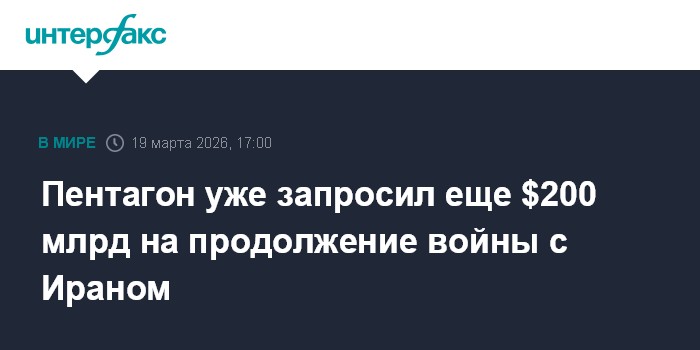 Москва. 19 марта. INTERFAX.RU - Пентагон запросил выделение дополнительно $200 млд на продолжение военной операции против Ирана, сообщил агентству AP высокопоставленный чиновник американской администрации.