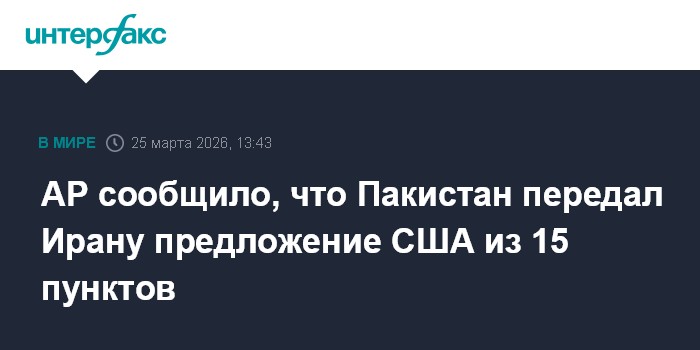 Москва. 25 марта. INTERFAX.RU - Пакистанская сторона, выступающая посредником в урегулировании ситуации на Ближнем Востоке, передала Тегерану предложение от США, состоящее из 15 пунктов, для прекращения боевых действий, сообщает в среду Associated Press со ссылкой на источники.