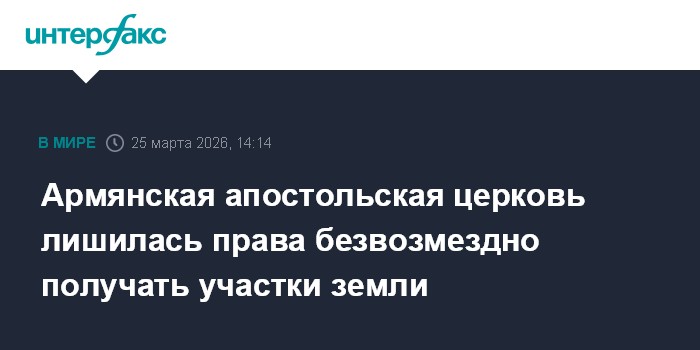 Москва. 25 марта. INTERFAX.RU - Парламент Армении принял в окончательном чтении поправку в Земельный кодекс о лишении Армянской апостольской церкви права безвозмездного получения в собственность земельных участков.