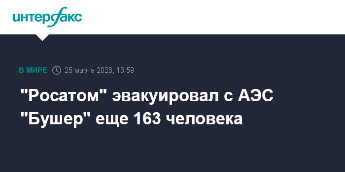 Москва. 25 марта. INTERFAX.RU - С иранской АЭС "Бушер" эвакуированы 163 человека, утром в 7:20 по московскому времени они выехали из Бушера в сторону границы с Арменией, сообщил глава "Росатома" Алексей Лихачев.