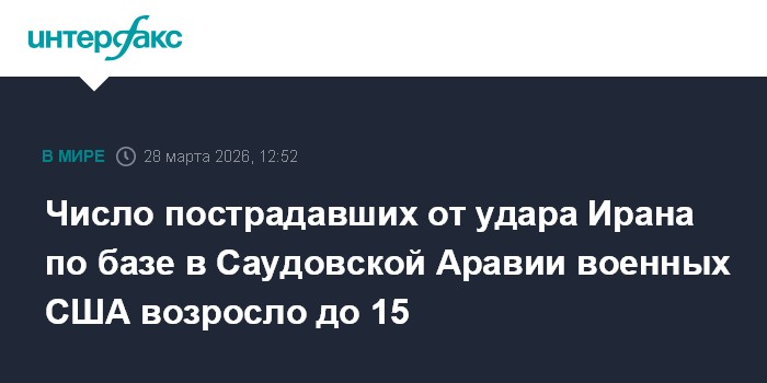 Москва. 28 марта. INTERFAX.RU - До 15 увеличилось число американских военных, пострадавших в результате последней атаки Ирана на авиабазу Принц Султан в Саудовской Аравии, сообщает в субботу Associated Press.