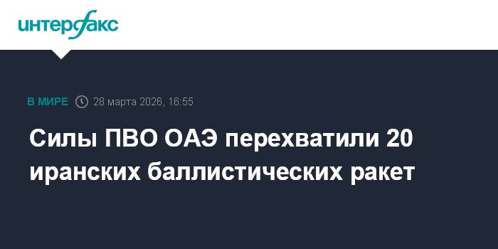 Москва. 28 марта. INTERFAX.RU - Средства противовоздушной обороны Объединенных Арабских Эмиратов в субботу сбили 20 баллистических ракет, запущенных Ираном, сообщило министерство обороны ОАЭ.