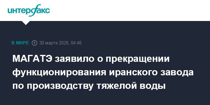 Москва. 30 марта. INTERFAX.RU - Иранский завод по производству тяжелой воды в Хондабе получил серьезные повреждения в результате нанесенных ударов и больше не функционирует, заявило Международное агентство по атомной энергии (МАГАТЭ).