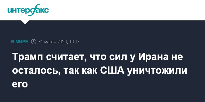 Москва. 31 марта. INTERFAX.RU - Президент США Дональд Трамп во вторник вновь выразил мнение, что американская операция в Иране не продлится слишком долго, поскольку Тегеран понес большие потери.