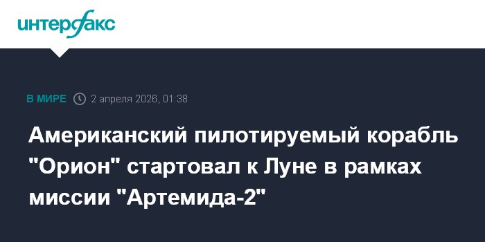 Москва. 2 апреля. INTERFAX.RU - Пилотируемый космический корабль Orion с четырьмя астронавтами на борту в четверг по московскому времени стартовал к Луне в рамках миссии Artemis II, сообщило NASA.