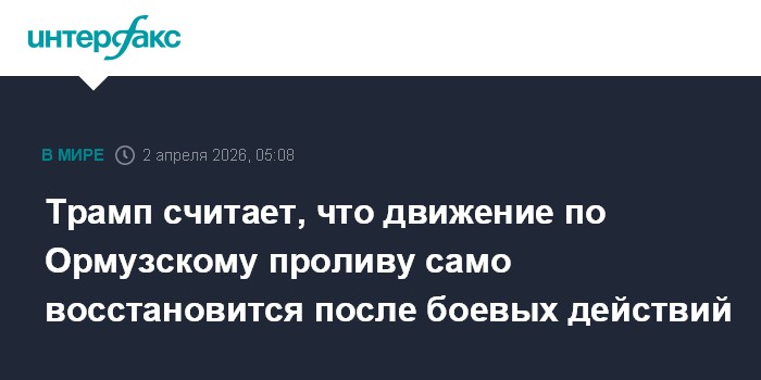 Москва. 2 апреля. INTERFAX.RU - Президент США Дональд Трамп полагает, что навигация в Ормузском проливе восстановится после завершения боевых действий, а о его безопасности должны позаботиться те страны, экономики которых в этом заинтересованы.