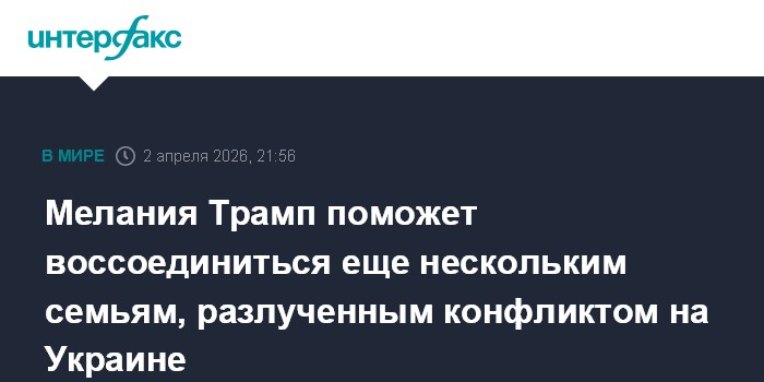 Москва. 2 апреля. INTERFAX.RU - Первая леди США Мелания Трамп уже в четвертый раз способствовала возвращению детей в их семьи после того, как они оказались разлучены в ходе конфликта на Украине, заявил Белый дом.