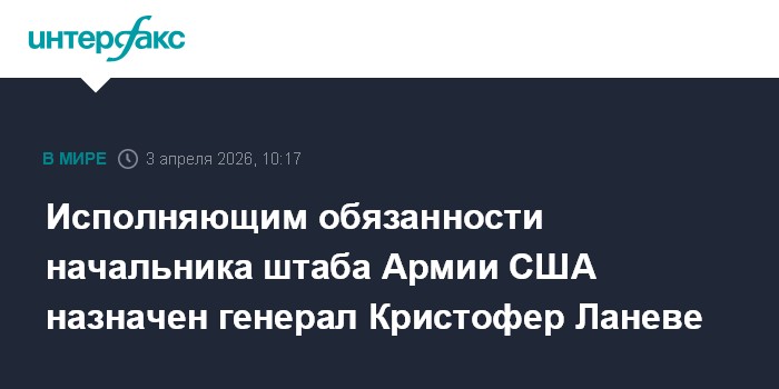 Москва. 3 апреля. INTERFAX.RU - Исполняющим обязанности начальника штаба Армии США назначен генерал Кристофер Ланеве, сообщил Fox News со ссылкой на высокопоставленный источник в Пентагоне.
