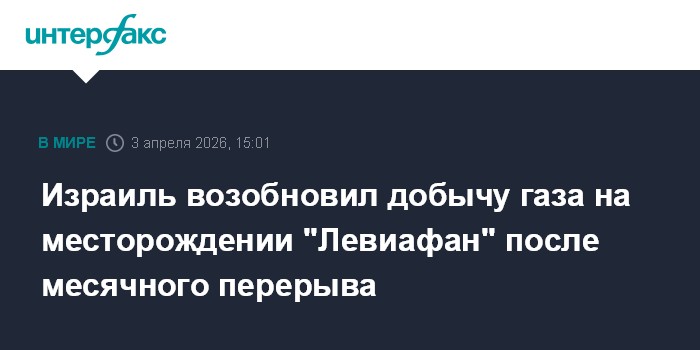 Москва. 3 апреля. INTERFAX.RU - Добыча природного газа на крупнейшем израильском месторождении "Левиафан" возобновилась после приостановки, вызванной началом военных действий против Ирана. Об этом сообщил представитель компании Newmed Energy агентству Bloomberg.