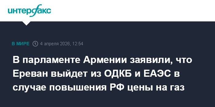 Москва. 4 апреля. INTERFAX.RU - Армения выйдет из ОДКБ и ЕАЭС, если Россия примет решение о повышении цен на поставляемый в республику российский газ, заявил спикер парламента Армении Ален Симонян.