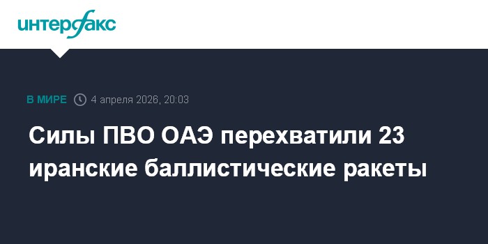 Москва. 4 апреля. INTERFAX.RU - Средства противовоздушной обороны Объединенных Арабских Эмиратов в субботу сбили 23 баллистические ракеты, запущенные Ираном, сообщило министерство обороны ОАЭ.
