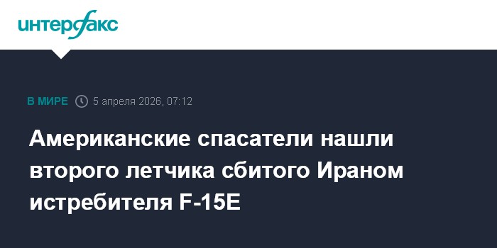 Москва. 5 апреля. INTERFAX.RU - Американская поисково-спасательная группа обнаружила второго летчика истребителя F-15E ВВС США, сбитого Ираном в пятницу, сообщил телеканал "Аль-Джазира" со ссылкой на американских представителей.