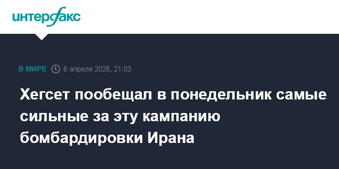 Москва. 6 апреля. INTERFAX.RU - Шеф Пентагона Пит Хегсет пообещал, что в понедельник США нанесут по Ирану наиболее мощные удары с момента начала военной кампании, а во вторник интенсивность атак вырастет еще больше.