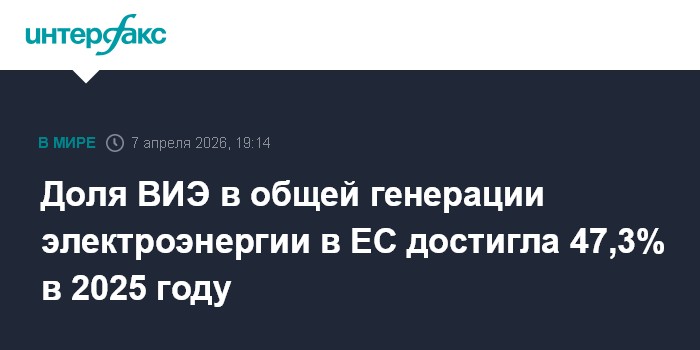 Москва. 7 апреля. INTERFAX.RU - Возобновляемые источники энергии (ВИЭ) в Европейском союзе в 2025 году обеспечили 47,3% всего производства электроэнергии по сравнению с 47,2% годом ранее, говорится в сообщении статистического управления ЕС.