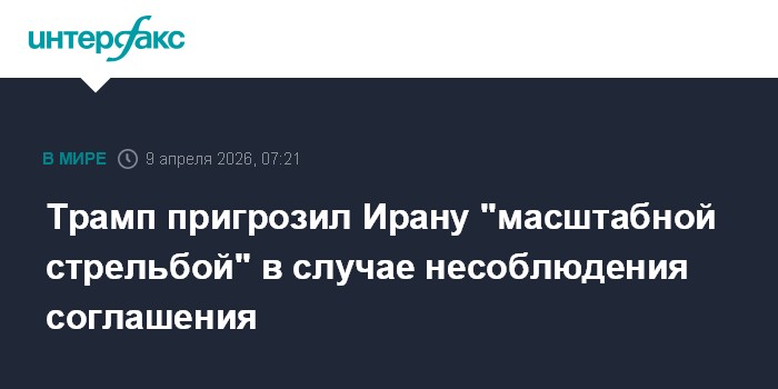 Москва. 9 апреля. INTERFAX.RU - Президент США Дональд Трамп призвал Иран придерживаться условий соглашения о прекращении огня, в противном случае начнется "масштабная перестрелка".