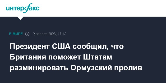 Москва. 12 апреля. INTERFAX.RU - Президент США Дональд Трамп заявил Fox news, что Великобритания и некоторые другие страны помогут американским военным избавить Ормузский пролив от мин.