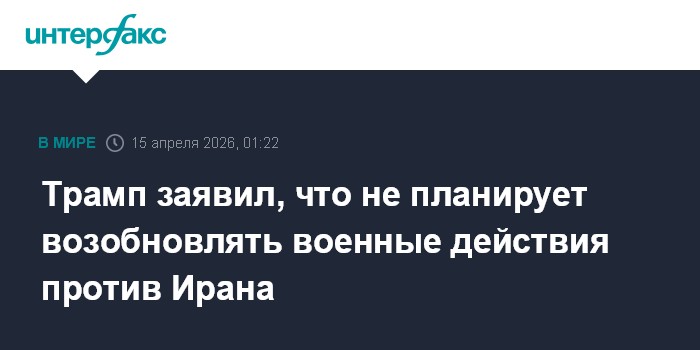 Москва. 15 апреля. INTERFAX.RU - Президент США Дональд Трамп заявил, что не собирается возобновлять военную операцию против Ирана, сообщила взявшая у него интервью журналист Fox News Мария Бартиромо.