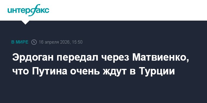 Москва. 16 апреля. INTERFAX.RU - Турецкий президент Реджеп Тайип Эрдоган просил передать президенту РФ Владимиру Путину, что в Турции очень ждут его приезда, заявила председатель Совета Федерации Валентина Матвиенко.