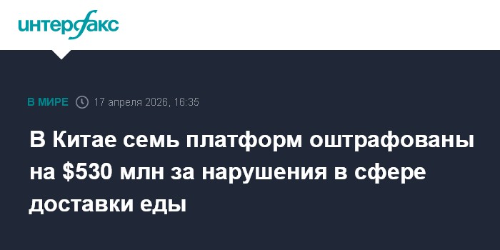 Москва. 17 апреля. INTERFAX.RU - Государственное управление по регулированию рынка (SAMR) Китая после расследования оштрафовало семь крупнейших платформ электронной торговли на 3,6 млрд юаней ($527 млн) за нарушения в сфере доставки еды, пишет South China Morning Post.