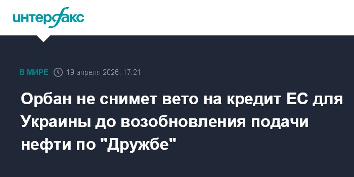 Москва. 19 апреля. INTERFAX.RU - Премьер Венгрии Виктор Орбан заявил, что по-прежнему не собирается снимать вето с кредита ЕС в 90 млрд евро для Украины до тех пор, пока не будут восстановлены поставки нефти по трубопроводу "Дружба".