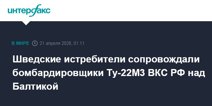 Москва. 21 апреля. INTERFAX.RU - Два шведских истребителя JAS 39 Gripen сил быстрого реагирования в понедельник поднимались в воздух для сопровождения группы российских дальних бомбардировщиков Ту-22М3, выполнявших полет над Балтийским морем, сообщили ВВС Швеции.