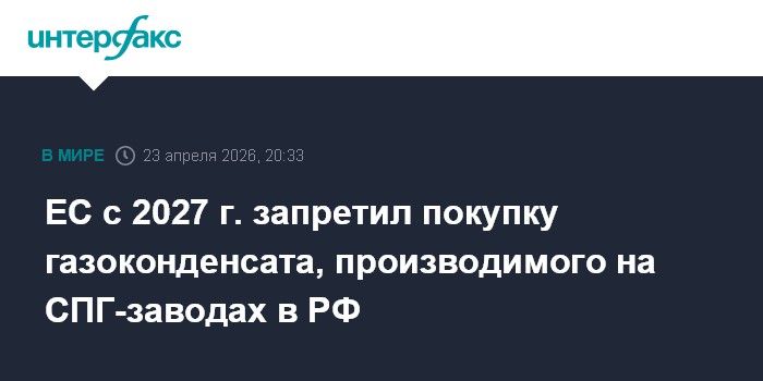 Москва. 23 апреля. INTERFAX.RU - Евросоюз в 20-м пакете санкций расширил запрет на покупку, импорт или трансфер российских нефти и нефтепродуктов газоконденсатом, который поступает с заводов по производству сжиженного природного газа (СПГ), говорится в официальном журнале ЕС.