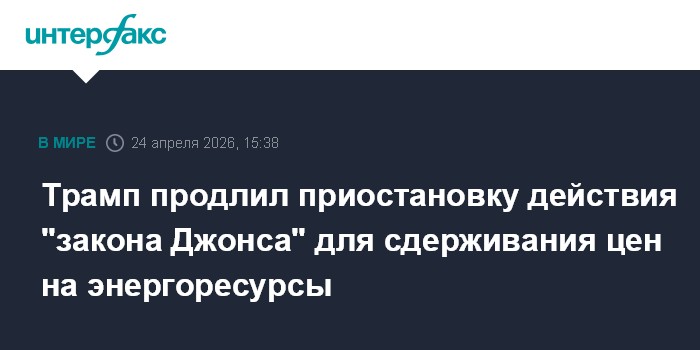 Москва. 24 апреля. INTERFAX.RU - Президент США Дональд Трамп продлил еще на 90 дней приостановку действия "Закона о торговом флоте" (более известного как "закон Джонса"), сообщила представитель Белого дома Тейлор Роджерс в соцсети X.