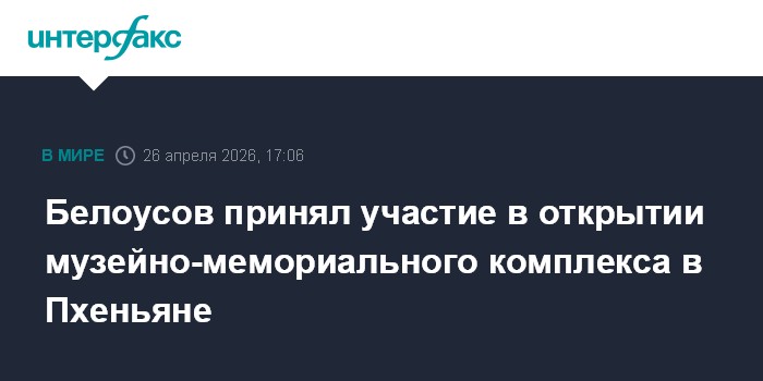 Москва. 26 апреля. INTERFAX.RU - Министр обороны России Андрей Белоусов в составе официальной делегации РФ принял участие в церемонии открытия в Пхеньяне музейно-мемориального комплекса, посвященного подвигу героев зарубежной военной операции.