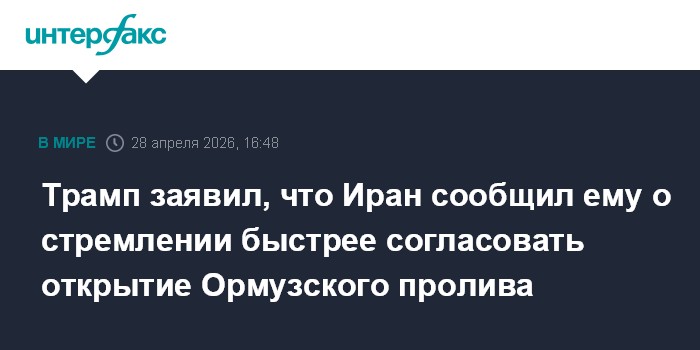 Москва. 28 апреля. INTERFAX.RU - Президент США Дональд Трамп заявил, что иранская сторона оказалась в сложной ситуации и просит США как можно быстрее согласовать открытие Ормузского пролива.