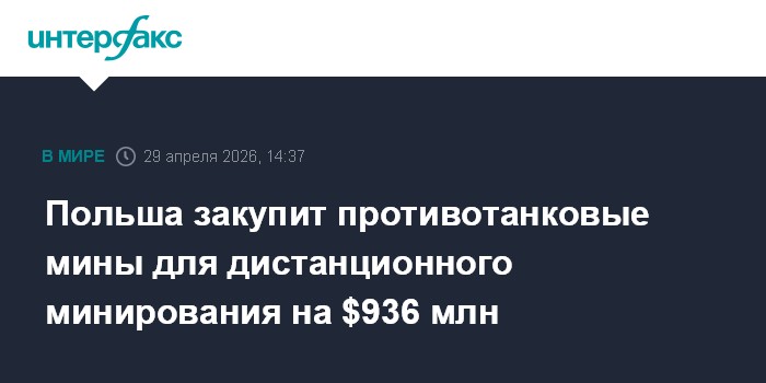 Москва. 29 апреля. INTERFAX.RU - Агентство вооружений при Минобороны Польши подписало контракт с заводом BELMA в Быдгоще на поставку 360 тыс. мин общей стоимостью более $930 млн, сообщила в среду пресс-служба ведомства.