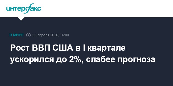 Москва. 30 апреля. INTERFAX.RU - Экономика США в первом квартале 2026 года увеличилась на 2% в пересчете на годовые темпы, сообщило министерство торговли страны.