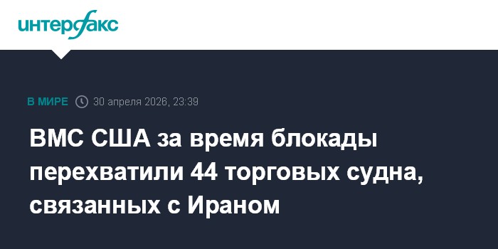 Москва. 30 апреля. INTERFAX.RU - С начала блокады американские ВМС перехватили 44 связанных с Ираном торговых судна, которые выходили из иранских портов или направлялись в них, сообщило в четверг Центральное командование ВС США на Ближнем Востоке (CENTCOM).