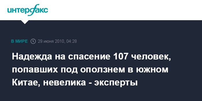 Пекин. 29 июня. ИНТЕРФАКС-КИТАЙ - Надежда на спасение 107 человек, погребенных сошедшим в южной китайкой провинции Гуйчжоу оползнем, остается крайне салой, сообщил журналистам на месте трагедии представитель спасательной службы.